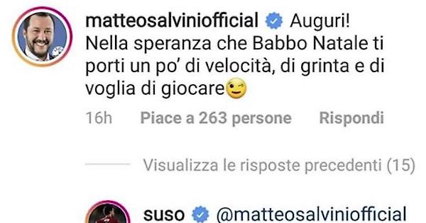 Botta e risposta su Instagram tra Suso e Matteo Salvini. Nel giorno del compleanno dello spagnolo il Milan, attraverso i canali social, ha fatto gli auguri al giocatore e il senatore ha commentato: "Auguri! Nella speranza che Babbo Natale ti porti un po' di velocità, di grinta e di voglia di giocare".
