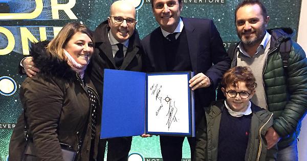 MILANO. Una giornata speciale per Gigi e Michela Ermetto, grandissima tifosa nerazzurro: i nipoti di Carmine Spadafora, il giornalista scomparso il 18 novembre scorso e grandissimo tifoso nerazzurro, sono stati ospiti del club milanese a San Siro per la partita contro la Spal vinta per 2-1 dalla formazione di Antonio Conte. Prima della gara, Gigi e Michela, che era accompagnata dal marito Luca e dal figlio Nicolò, hanno ricevuto in dono dal vicepresidente Javier Zanetti il volume con la storia dell'Inter con tanto di dedica. In cambio, i nipoti di Carmine hanno donato a Zanetti, al presidente Steven Zhang e all'amministratore delegato Beppe Marotta un cornetto portafortuna opera dei maestri artigiani di Torre del Greco. «La storia dell’Inter è la storia della vita di Carmine. Ed è il modo migliore per ricordarlo» ha detto Zanetti.