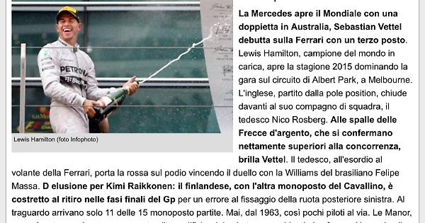 La Mercedes apre il Mondiale con una doppietta in Australia, Sebastian Vettel debutta sulla Ferrari con un terzo posto. Lewis Hamilton, campione del mondo in carica, apre la stagione 2015 dominando la gara sul circuito di Albert Park, a Melbourne. L'inglese, partito dalla pole position, chiude davanti al suo compagno di squadra, il tedesco Nico Rosberg. Alle spalle delle Frecce d'argento, che si confermano nettamente superiori alla concorrenza, brilla Vettel. Il tedesco, all'esordio al volante della Ferrari, porta la rossa sul podio vincendo il duello con la Williams del brasiliano Felipe Massa. D elusione per Kimi Raikkonen: il finlandese, con l'altra monoposto del Cavallino, è costretto al ritiro nelle fasi finali del Gp per un errore al fissaggio della ruota posteriore sinistra. Al traguardo arrivano solo 11 delle 15 monoposto partite. Mai, dal 1963, così pochi piloti al via. Le Manor, come è noto, non hanno preso parte alle qualifiche del sabato per problemi al software. Un guaio alla schiena ha messo ko Valtteri Bottas (Williams). Prima del semaforo verde, invece, guasti fatali per la McLaren del danese Kevin Magnussen e per la Red Bull del russo Daniil Kvyat.