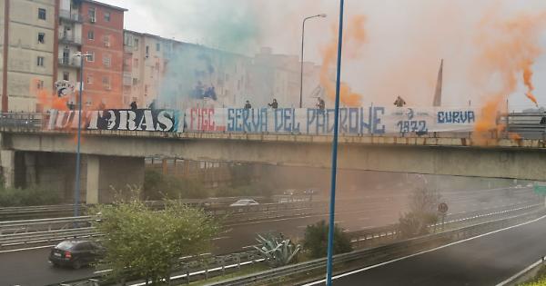 «Figc serva del padrone». Così recita uno striscione degli Ultras 72 curva B esposto dal ponte della tangenziale nei pressi dell'uscita Fuorigrotta al passaggio del bus della squadra.