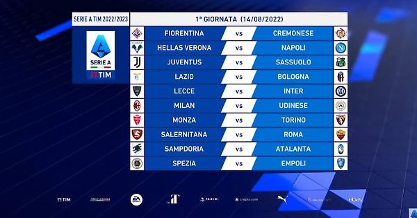 È stato sorteggiato il calendario della Serie A 2022-2023. Nella prima giornata il Milan campione d'Italia esordirà in casa contro l'Udinese nel fine settimana del 13-14 agosto. l'Inter al via in trasferta contro il Lecce, mentre la Juventus ospiterà il Sassuolo. Questa la prima giornata: Fiorentina-Cremonese; Verona-Napoli; Juventus-Sassuolo; Lazio-Bologna; Lecce-Inter; Milan-Udinese; Monza-Torino; Salernitana-Roma; Sampdoria-Atalanta; Spezia-Empoli.