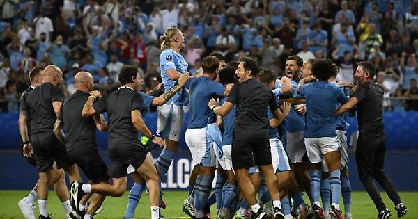 Il City si insedia nella metà campo avversaria, chiamando Bounou alla parata in almeno 3 occasioni senza però innescare Haaland con continuità. Il Siviglia si difende e riparte quando ha spazio: alla prima occasione vera, gli spagnoli passano in vantaggio. Al 25' arriva il gol En-Nesyri, a segno con un potente colpo di testa. I campioni d'Inghilterra cercano di aumentare la pressione e si sbilanciano. In avvio di ripresa serve un miracolo di Ederson al 50' per negare il raddoppio a En-Nesyri, che si rende pericoloso anche al 53'. Il Siviglia punge con Ocampos al 58' ma non punisce il City, che al 63' pareggia. Cross di Rodri, Palmer sul secondo palo è puntuale: dosato colpo di testa e lob che vale l'1-1. La formazione di Guardiola insiste ma non sfonda: Bounou è sempre attento e non concede nulla. Si va ai rigori, segnano tutti. Tranne Gudelj, che stampa il pallone sulla traversa: la Supercoppa europea è del Manchester City, Guardiola vince il 36esimo trofeo da allenatore