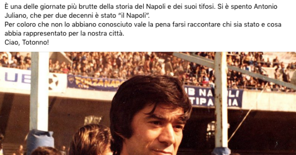 "È una delle giornate più brutte della storia del Napoli e dei suoi tifosi. Si è spento Antonio Juliano, che per due decenni è stato 'il Napoli'. Per coloro che non lo abbiano conosciuto vale la pena farsi raccontare chi sia stato e cosa abbia rappresentato per la nostra città. Ciao, Totonno!". Questo il messagio sui social del Napoli, condiviso anche dal presidente Aurelio De Laurentiis che ha scritto: "Il mio cordoglio e quello di tutto il Napoli". "Il mondo del calcio - si legge nel post del Napoli - e la città piangono la scomparsa di Antonio Juliano, figura storica e bandiera azzurra. Juliano ha segnato un'epoca indelebile prima da calciatore e poi da dirigente. Cresciuto nelle giovanili, ha vestito per 17 anni la maglia del Napoli diventandone capitano e simbolo generazionale. Dopo aver vinto la prima Coppa Italia giovanissimo nel 1962, fu il primo napoletano a conquistare la Coppa Italia da capitano nel 1976. Centrocampista di talento e personalità, Juliano ha fatto parte anche della Nazionale Campione d'Europa del 1968 e vice Campione del Mondo nel 1970, giocando tre Mondiali e disputando la finale contro il Brasile in Messico. Il suo legame con il Napoli non si staccò mai anche quando smise di giocare. Divenne dirigente azzurro e sotto la sua carica di Direttore Generale arrivò l'acquisto di Diego Maradona. Fiero figlio di Napoli e icona della fedeltà azzurra, Juliano lascia una eredità sportiva ed emotiva che resterà per sempre nella memoria. Il Presidente Aurelio De Laurentiis, i dirigenti, lo staff tecnico, la squadra e tutta la SSC Napoli si uniscono al dolore della famiglia per la scomparsa di Antonio Juliano, indimenticabile capitano ed eterna bandiera azzurra".