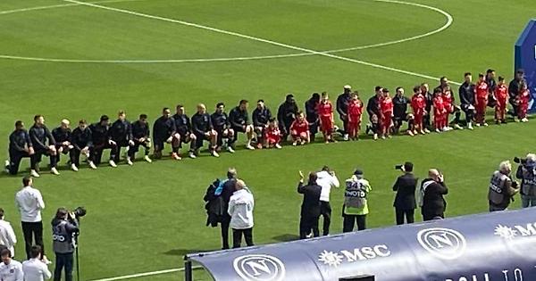 I giocatori del Napoli si sono inginocchiati, durante l'inno della Serie A prima del match con l'Atalanta allo stadio Maradona, nel gesto ormai noto per dire "no al razzismo". Un'iniziativa decisa dopo la mancata squalifica del difensore dell'Inter Francesco Acerbi per il presunto insulto razzista al difensore azzurro Juan Jesus.