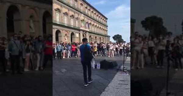 “Abbracciame" di Andrea Sannino è stata l'inno dei napoletani nei momenti difficili del lockdown e ora che il peggio sembra essere alle spalle risuona in una piazza Plebiscito piena di gente e colori. A proporla, nel suo arrangiamento, un artista di strada. Il coro parte spontaneo e grandi e piccoli si fanno vicini, tutti rigorosamente in mascherina, per cantare ancora una volta “Abbracciame".