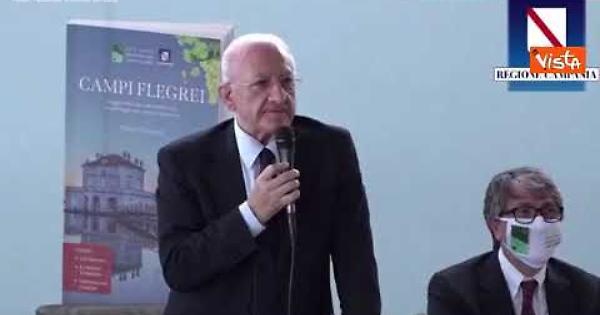 NAPOLI. Il presidente della Campania De Luca rimprovera due persone nel pubblico che parlano durante il suo discorso: «Dite a quei due che fanno salotto di fermarsi, non vorremmo disturbare». De Luca era a Capo Miseno (Na) per presentare la guida ufficiale del Parco regionale dei Campi Flegrei. / Facebook Vincenzo De Luca (Agenzia Vista / Alexander Jakhnagiev)