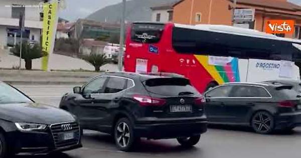 Le immagini del corteo di bus turistici che, con manifesti funebri sulla fiancata, attraversa Caianello dopo un corteo che si è svolto sulla A1 per denunciare la crisi del settore. / Facebook (Agenzia Vista / Alexander Jakhnagiev)