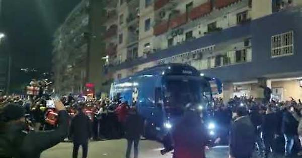 L'arrivo del Napoli allo stadio Maradona per il match con la Juve. Il bus che porta la squadra azzurra è giunto allo stadio alle 19,15 accolto dai fuochi d'artificio dei tifosi, centinaia dei quali hanno celebrato con cori l'arrivo della squadra di Spalletti.